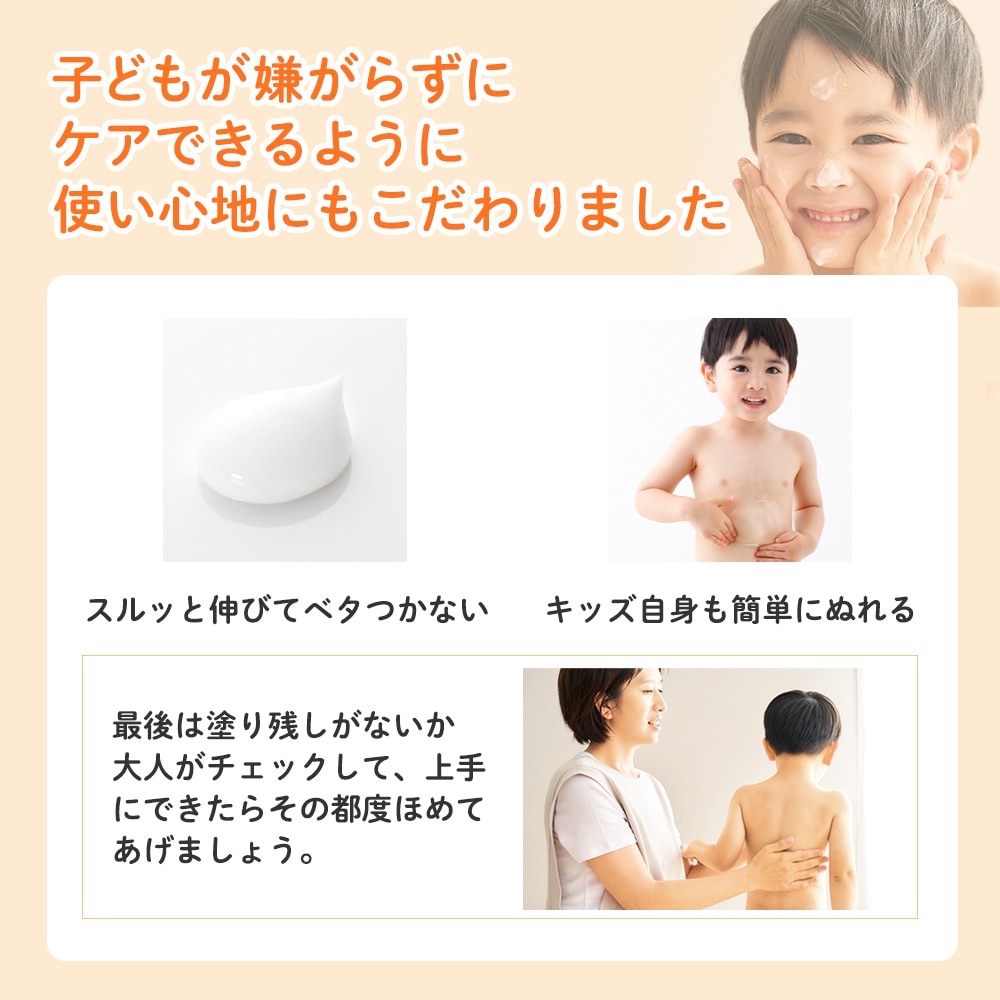 やわらかくソフトなクリームだから、ベタつきが苦手なキッズにも◎。肌にするっと広がって、カサつきやすい肌をうるおします。